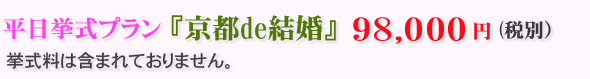 この平日挙式プラン『京都de結婚』は、京都市内の挙式場(神社・寺院・人前式)で、土日祝以外の平日に結婚式を挙げられる方の為のプランで、新郎新婦様にご用意頂く物はありません。